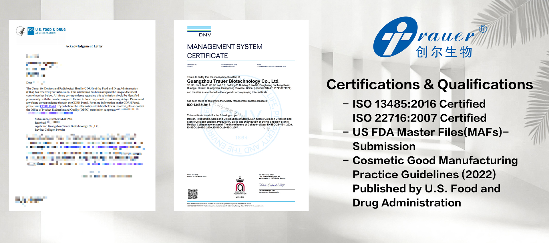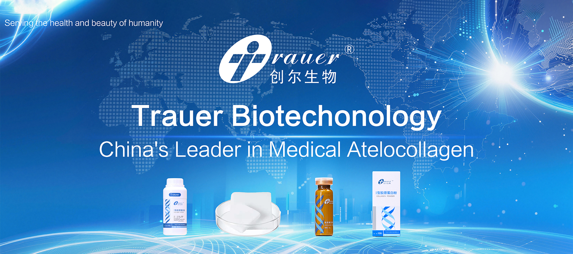 Established in August 2002, Guangzhou Trauer Biotechnology Co., Ltd. is a high-tech enterprise, which masters the key technologies of medical atelocollagen preparation, specializing in the research, development, production and sales bioactive collagen materials, medical devices and bio-skincare products. As the pioneer of collagen dressing in China, Trauer has the first sterile Class Ⅲ collagen dressing in China. With 23 years of development, Trauer has become the leader in the field of bioactive collagen biomedical material in China, and is committed to becoming the leading enterprise of medical collagen across the globe.